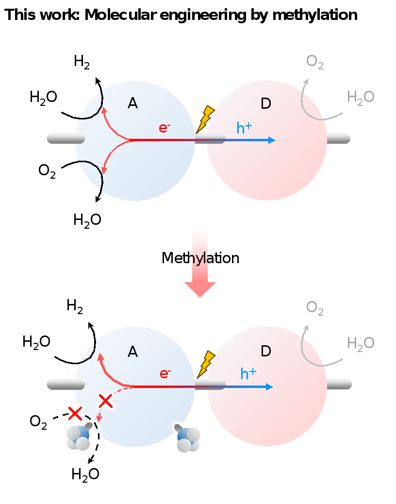 In-situ Fourier-transform infrared spectroscopy (FT-IR) and photocatalytic characterizations further showed that methylation promotes the forward hydrogen evolution reaction (HER) while inhibiting approximately 70% of the backward oxygen reduction reaction (ORR). From a molecular orbital perspective, this is explained by a significant peak shift in the antibonding direction (from -0.388 to -0.314) and an elevated energy barrier against O₂ adsorption and H₂O desorption, respectively. By simultaneously obstructing electron transfer and increasing the kinetic barrier for O₂ adsorption, the proton-coupled electron transfer (PCET) process of ORR is substantially suppressed.