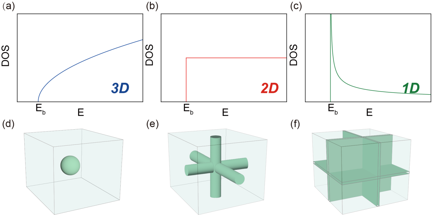Schematic of the electronic density of states (top row) and corresponding Fermi surfaces (bottom row) for different dimensional systems.(Image by Prof. LIN’s group)